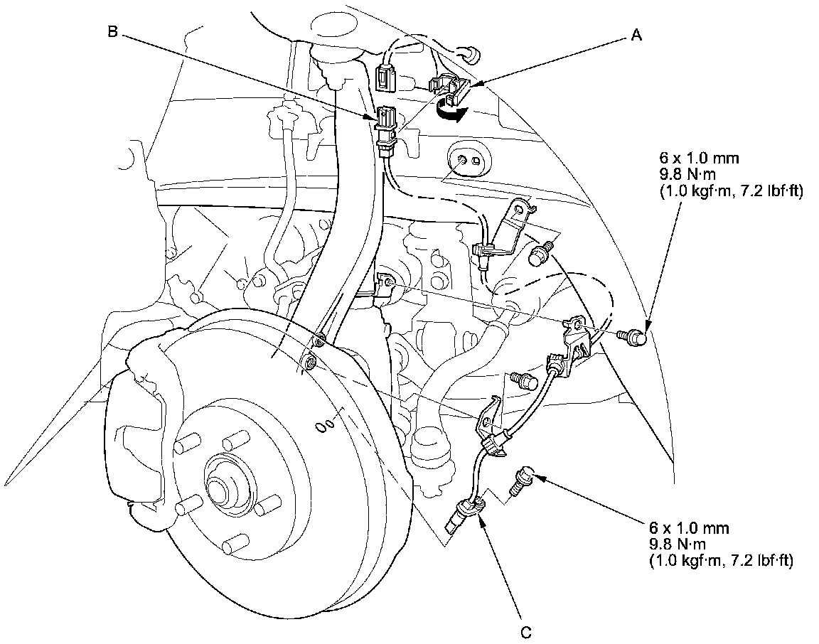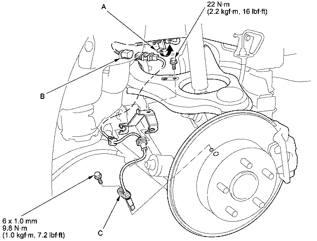 3. Remove the clamps, the bolt, and the wheel speed sensor (C).