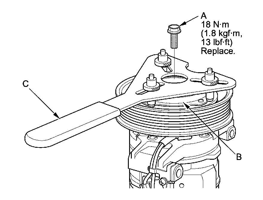1. Remove the center bolt (A) while holding the pressure plate (B) with the A/C clutch holder (C).