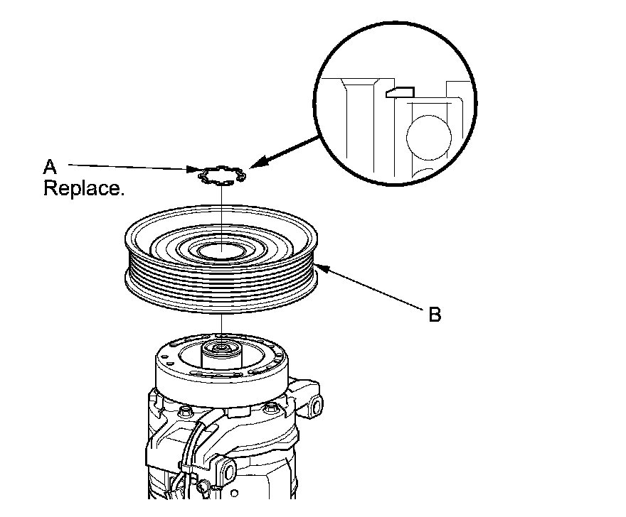 3. If you are replacing the field coil, remove the snap ring (A) with snap ring pliers, then remove the pulley (B). Be careful not to damage the pulley or the A/C compressor.