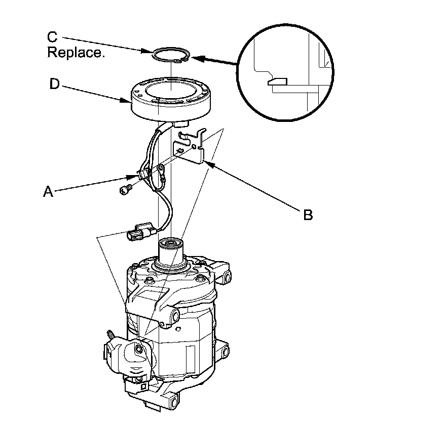4. Remove the screw, the wire harness clip (A), and the holder (B). Remove the snap ring (C) with snap ring pliers, then remove the field coil (D). Be careful not to damage the field coil or the A/C compressor.