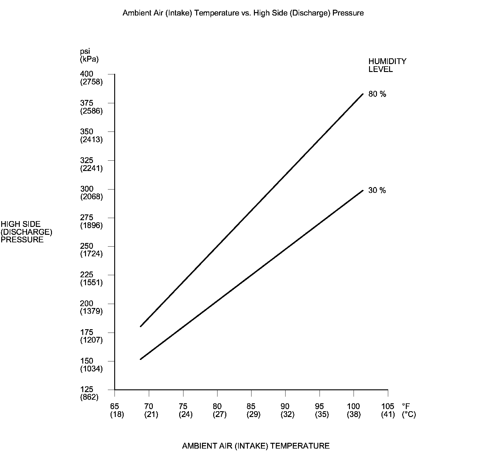 NOTE: The high side pressure and the ambient air temperature should intersect in the shaded area. Any measurements outside the area may indicate the need for further inspection.