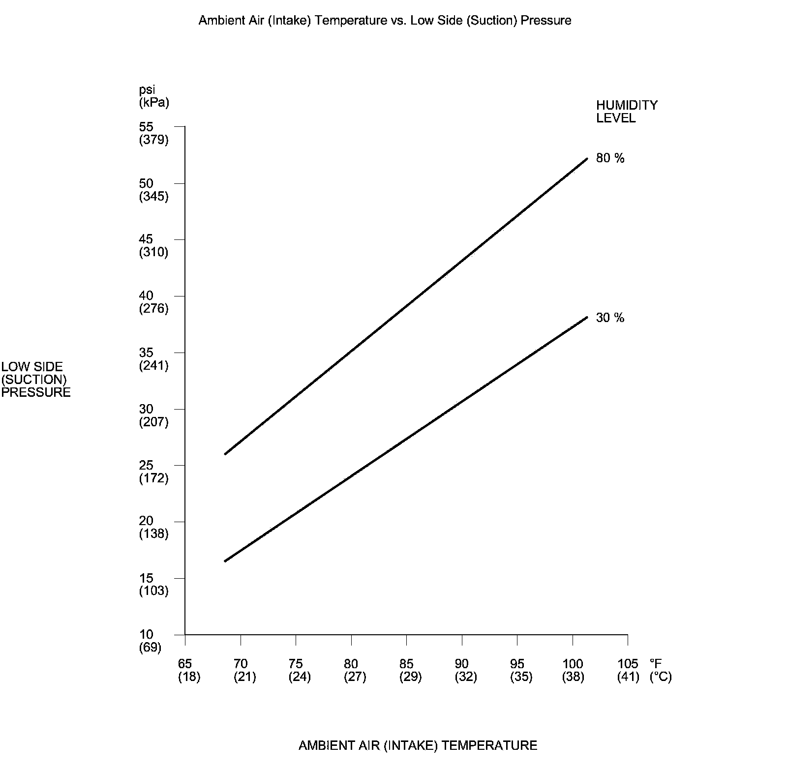 NOTE: The low side pressure and the ambient air temperature should intersect in the shaded area. Any measurements outside the area may indicate the need for further inspection.