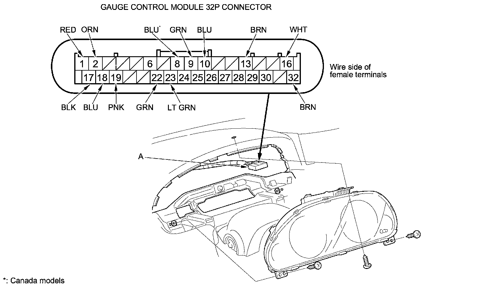 2. Remove the gauge control module Gauge Control Module Replacement, and disconnect the 32P connector (A) from it.