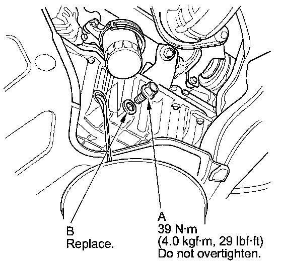 3. Reinstall the drain bolt with a new washer (B) and torque to specification.