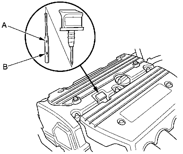 3. Remove the dipstick, and check the engine oil level. It should be between the upper mark (A) and the lower mark (B).