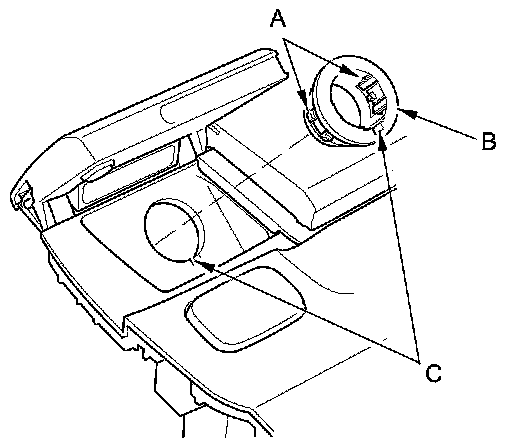 9. Gently depress the tabs (A), then remove the housing (B) from the panel. Note the location of the indexing tabs (C).