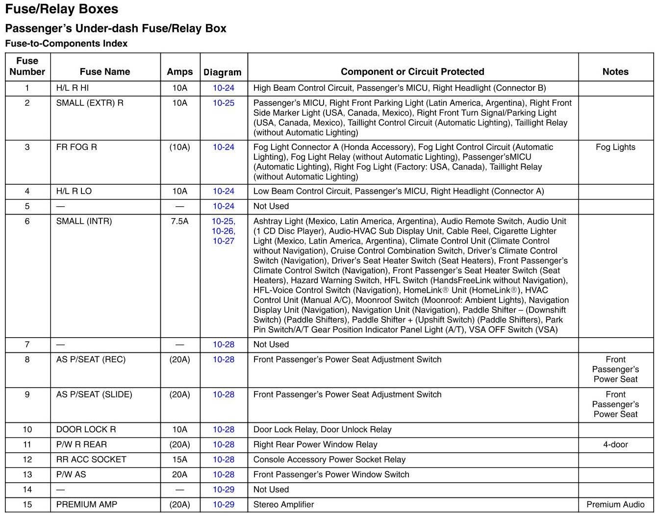 Passenger's Under-dash Fuse/Relay Box - Fuse-to-Components Index