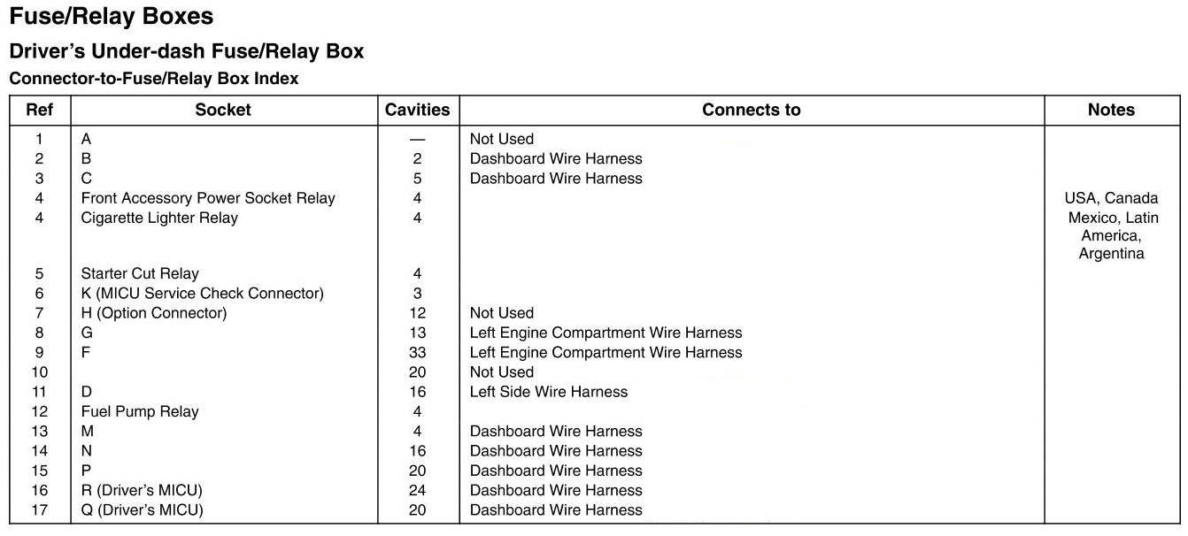 Driver's Under-dash Fuse/Relay Box - Connector-to-Fuse/Relay Box Index