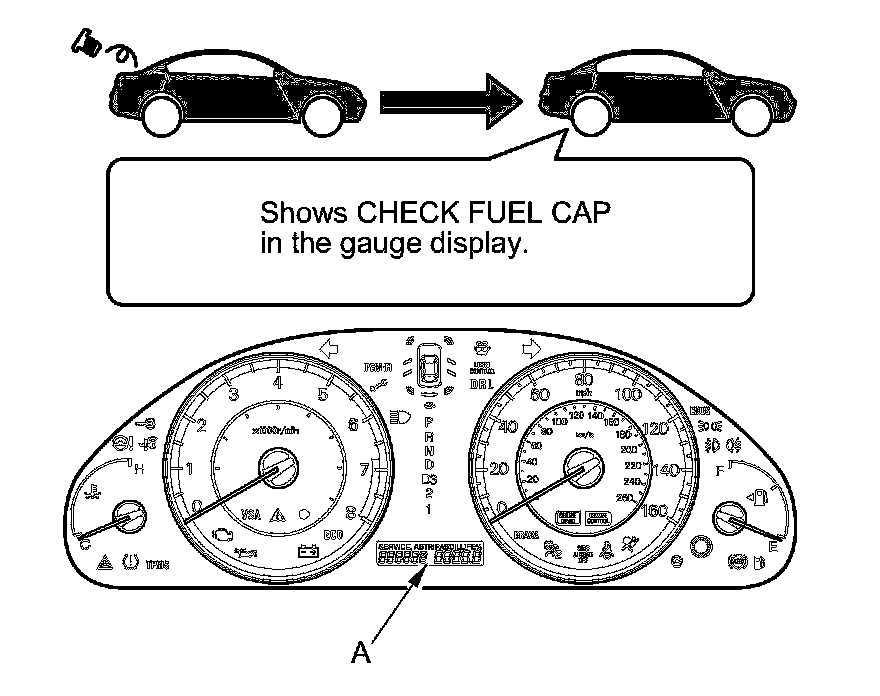 The first time a leak is detected, a CHECK FUEL CAP message appears on the gauge display (A). To scroll to another message, press the select/reset button. The CHECK FUEL CAP message appears each time you restart the engine until the system turns the message off. Turn the engine off, then replace or tighten the fuel fill cap until it clicks at least once.