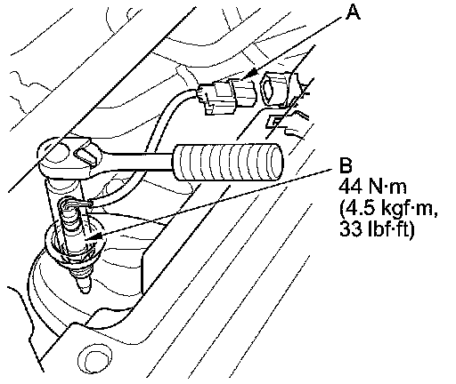 1. Disconnect the A/F sensor 4P connector (A), then remove the A/F sensor (B).