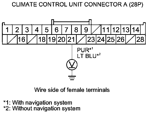 7. Measure the voltage between climate control unit connector A (28P) terminal No. 21 and body ground.