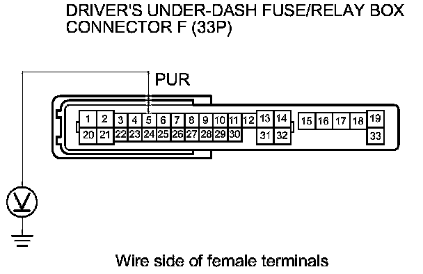 8. Measure the voltage between driver's under-dash fuse/relay box connector F (33P) terminal No. 5 and body ground.