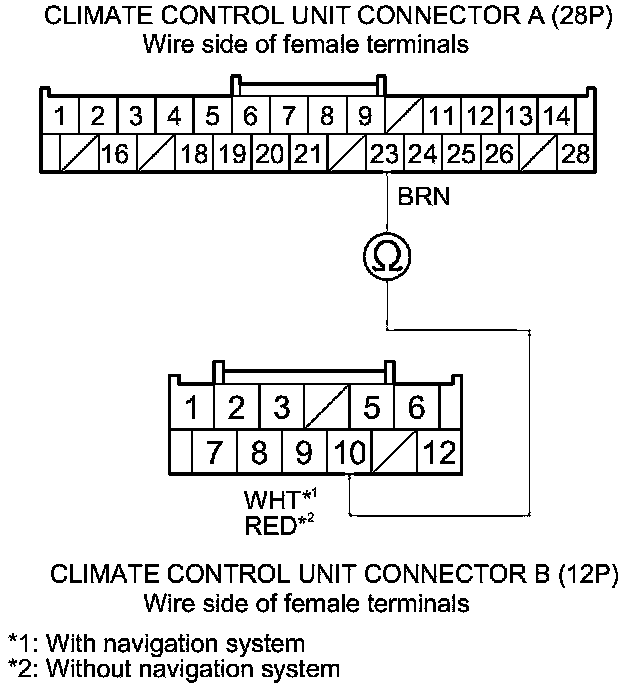 11. Measure the evaporator temperature sensor resistance between climate control unit connector A (28P) terminal No. 23 and connector B (12P) terminal No. 10.