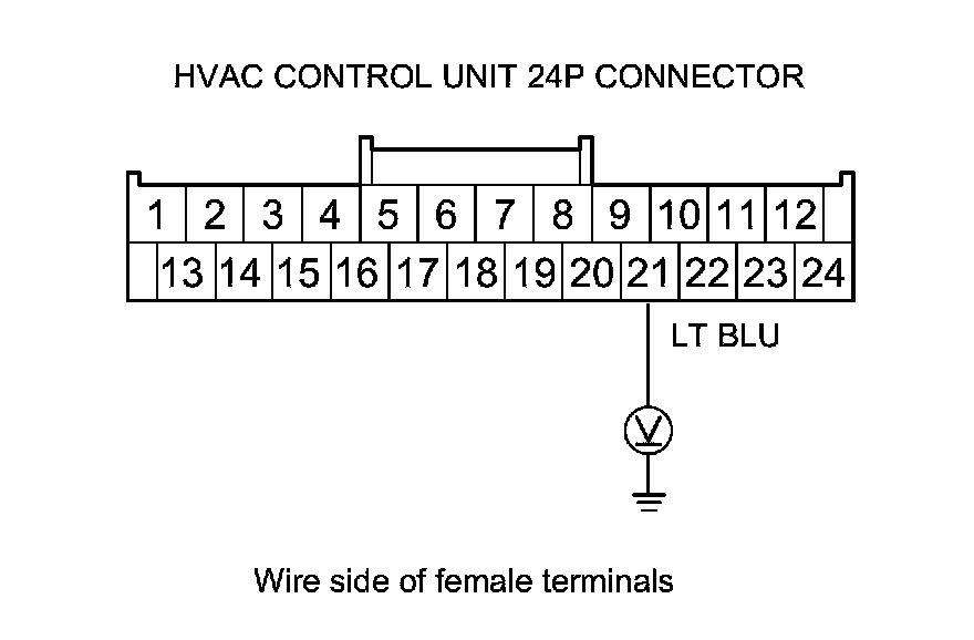 6. Measure the voltage between HVAC control unit 24P connector terminal No. 21 and body ground.