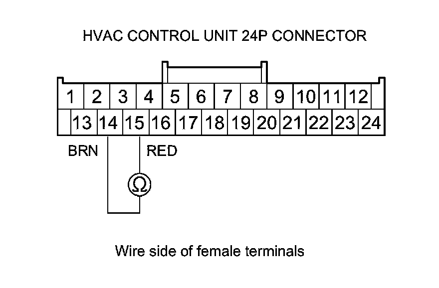 9. Measure the evaporator temperature sensor resistance between HVAC control unit 24P connector terminals No. 14 and No. 15.