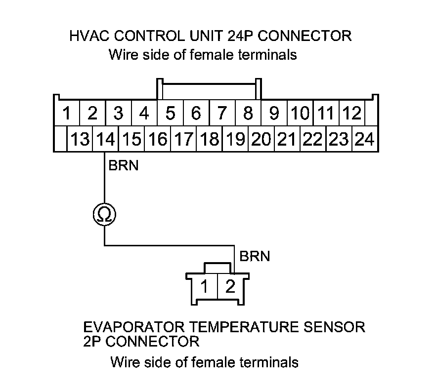 11. Check for continuity between HVAC control unit connector terminal No. 14 and evaporator temperature sensor 2P connector terminal No. 2.