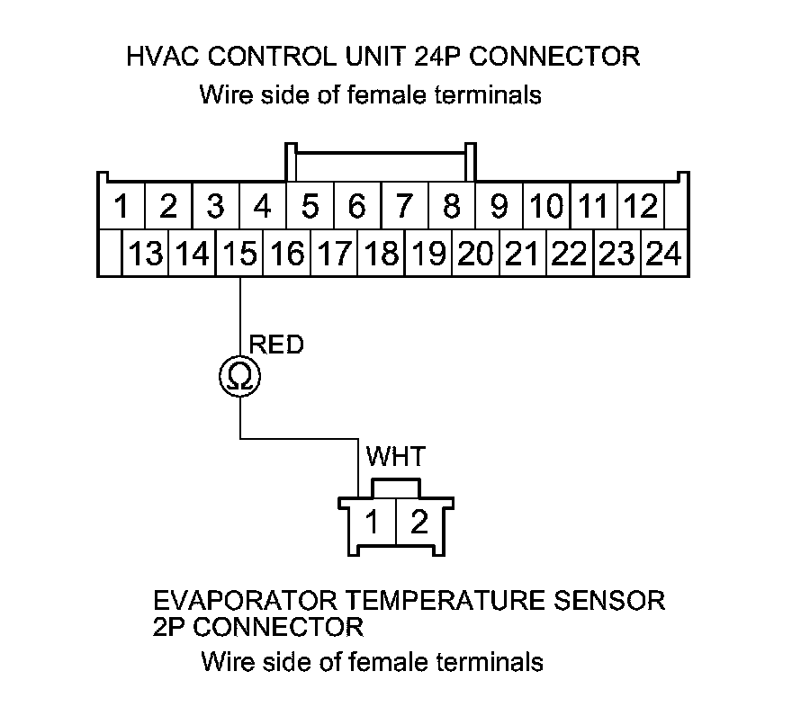 12. Check for continuity between HVAC control unit connector terminal No. 15 and evaporator temperature sensor 2P connector terminal No. 1.