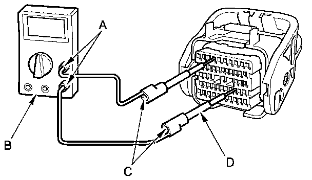 5. Connect one side of the patch cord's terminals (A) to a commercially available digital multimeter (B), and connect the other side of the terminals (C) to a commercially available banana jack (Pomona Electronics Tool No. 3563 or equivalent) (D).