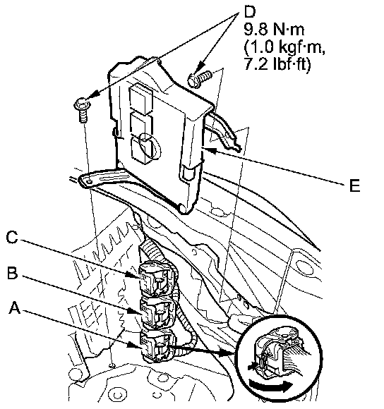 10. Disconnect ECM/PCM connectors A, B, and C, then remove the ECM/PCM assembly (E).