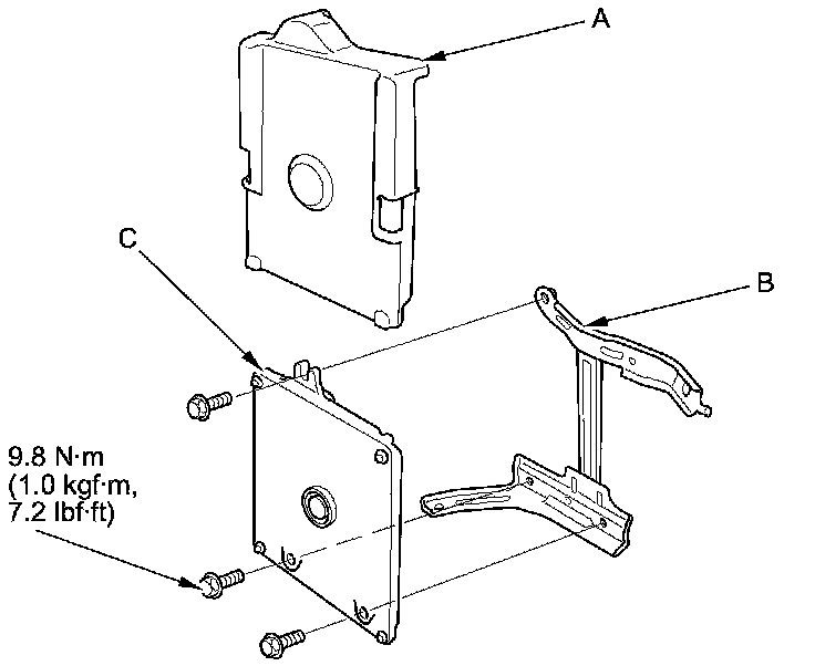 11. Remove the cover (A) and the bracket (B) from the ECM/PCM (C).