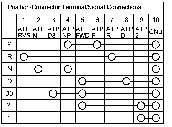 5. Check for continuity between the terminals at the subharness connector. There should be continuity between the terminals in the following table for each shift lever position.