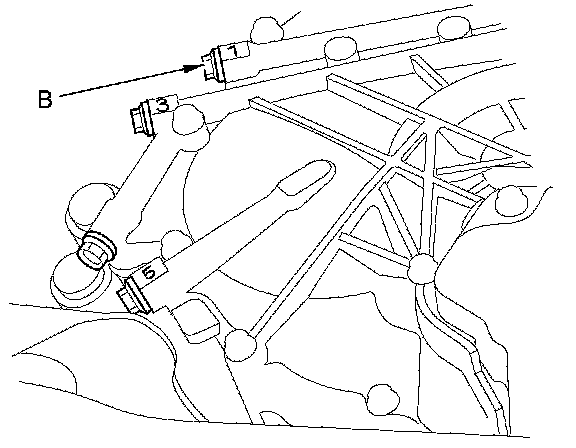 14. Shift to 1, and measure the 1st clutch pressure at the 1st clutch pressure inspection port (B) while holding the engine speed at 2,000 rpm.