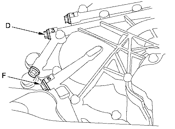 19. Connect the A/T oil pressure gauge to the 3rd clutch pressure inspection port (D) and the 5th clutch pressure inspection port (F).