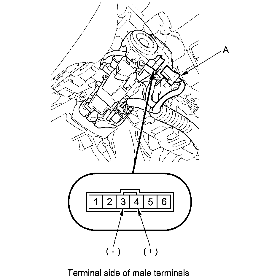 4. Connect power to steering lock 6P connector terminal No. 4, and ground terminal No. 3. Check that the ignition key cannot be turned to LOCK (0). Disconnect power, and check that the key can be turned to the LOCK (0) position and removed from the cylinder.