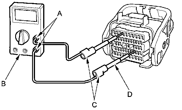 5. Connect one side of the patch cord's terminals (A) to a commercially available digital multimeter (B), and connect the other side of the terminals (C) to a commercially available banana jack (Pomona Electronics Tool No. 3563 or equivalent) (D).
