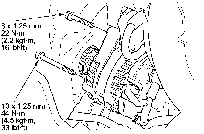 2. Tighten the two bolts securing the alternator.