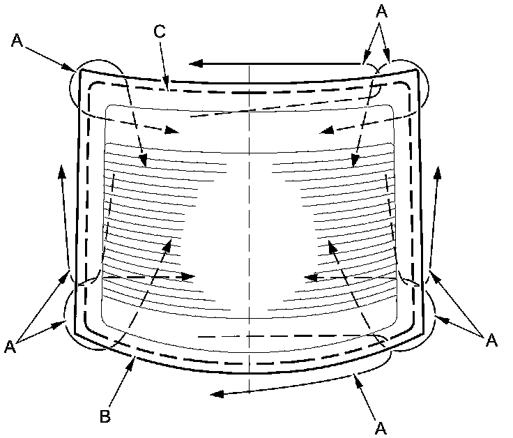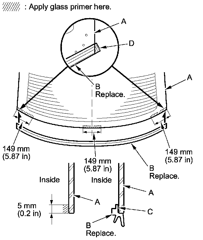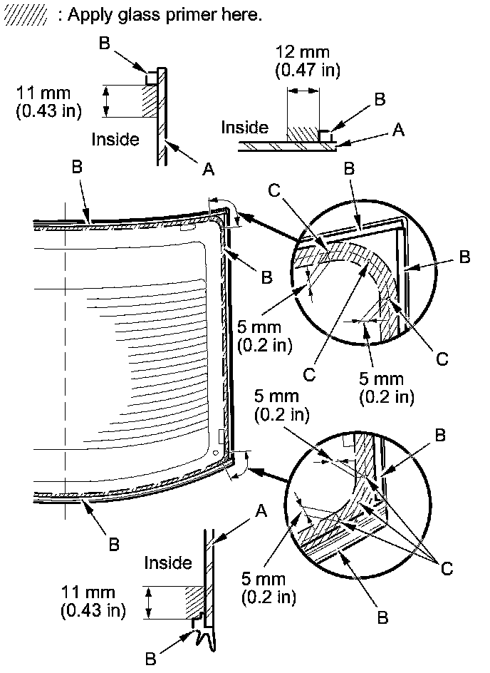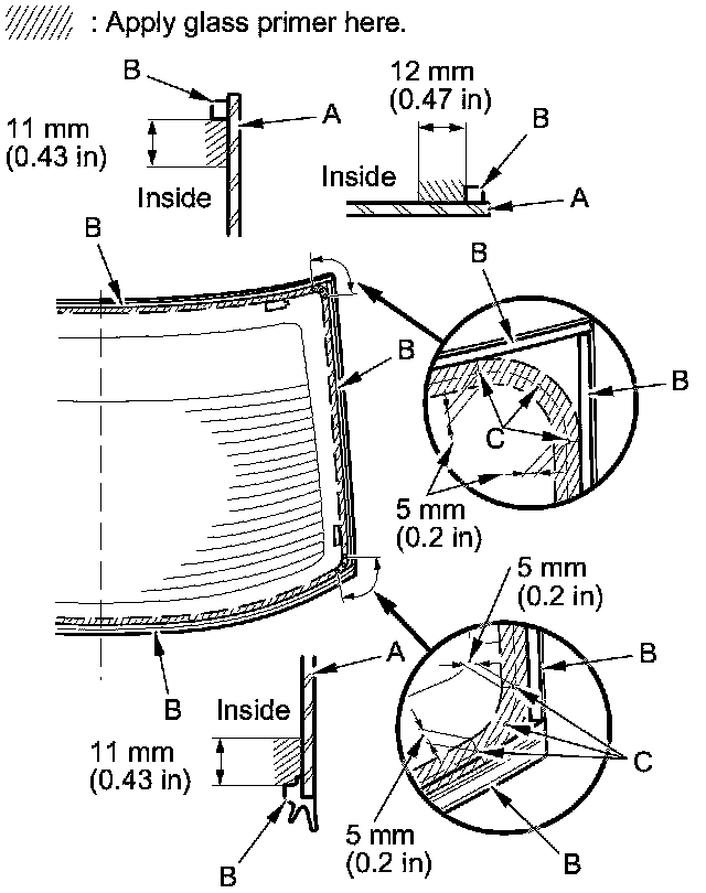 - Apply the glass primer to the corner areas of the rear window using the printed dots (C) on the rear window as a guide.