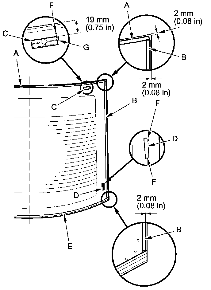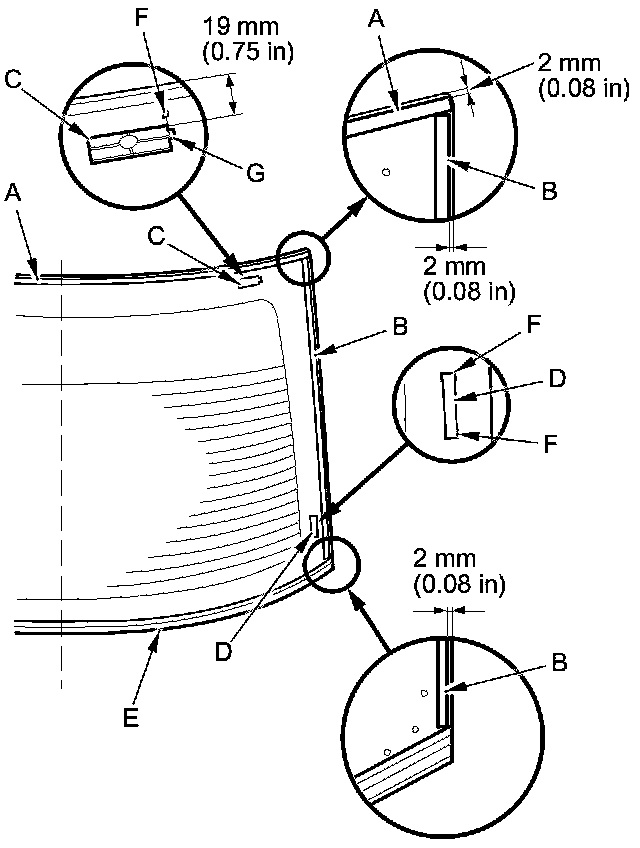 9. Scrape smooth the original adhesive with a knife until there is a thickness of about 2 mm (0.08 in) on the bonding surface around the entire rear window opening flange: