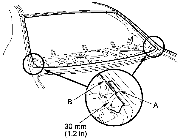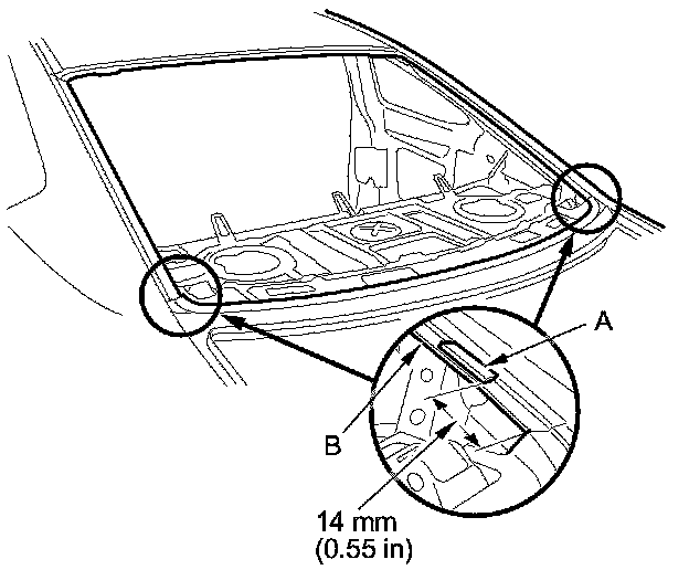 14. Attach the fasteners (A) with the adhesive tape to the rear window opening flange (B) of the body on both sides.