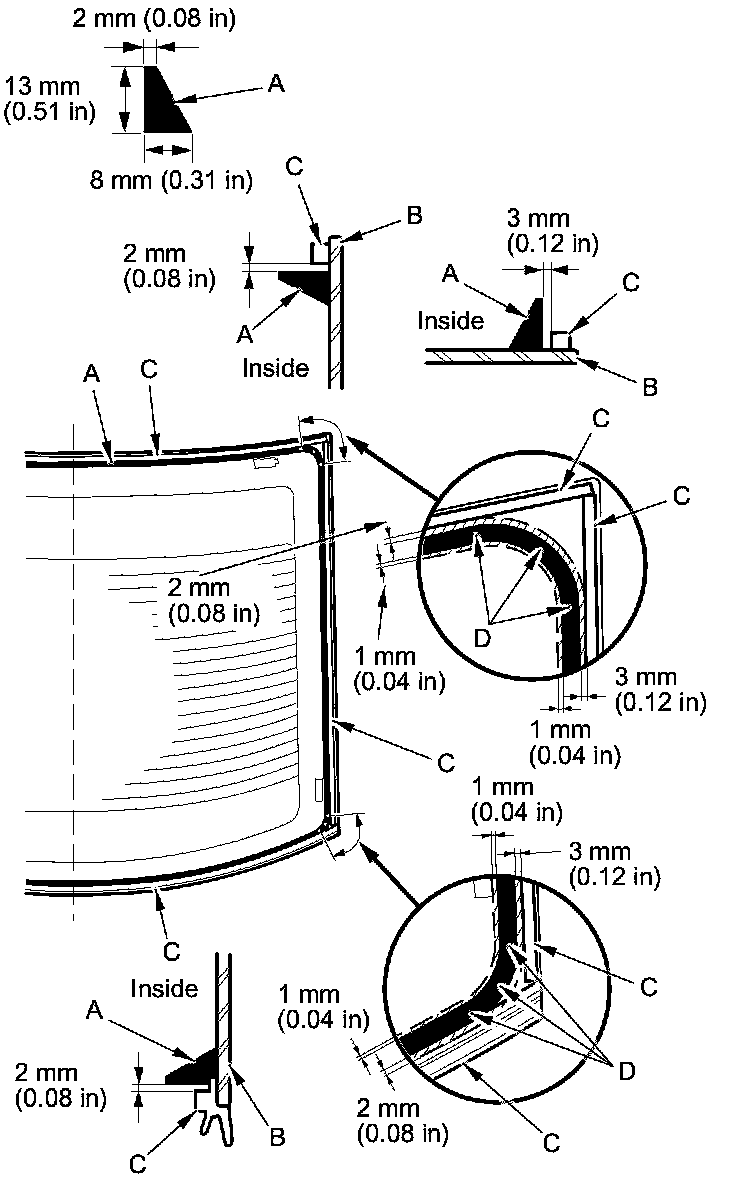 13. Apply glass primer to the upper clip mounting areas on the windshield, and let it dry. Attach the upper rubber dam (A), the side rubber dams (B), the upper clips (C), and the fasteners (D) with the adhesive tape to the inside face of the rear window (E) as shown: