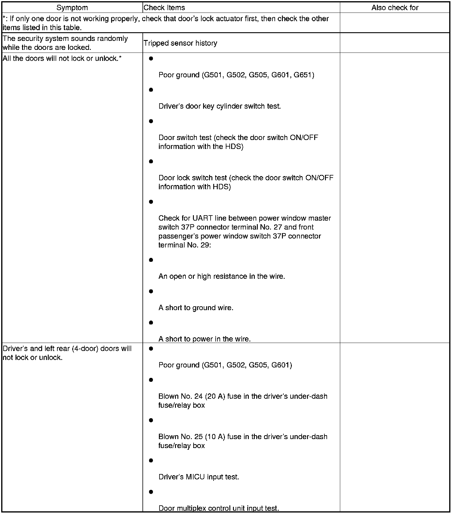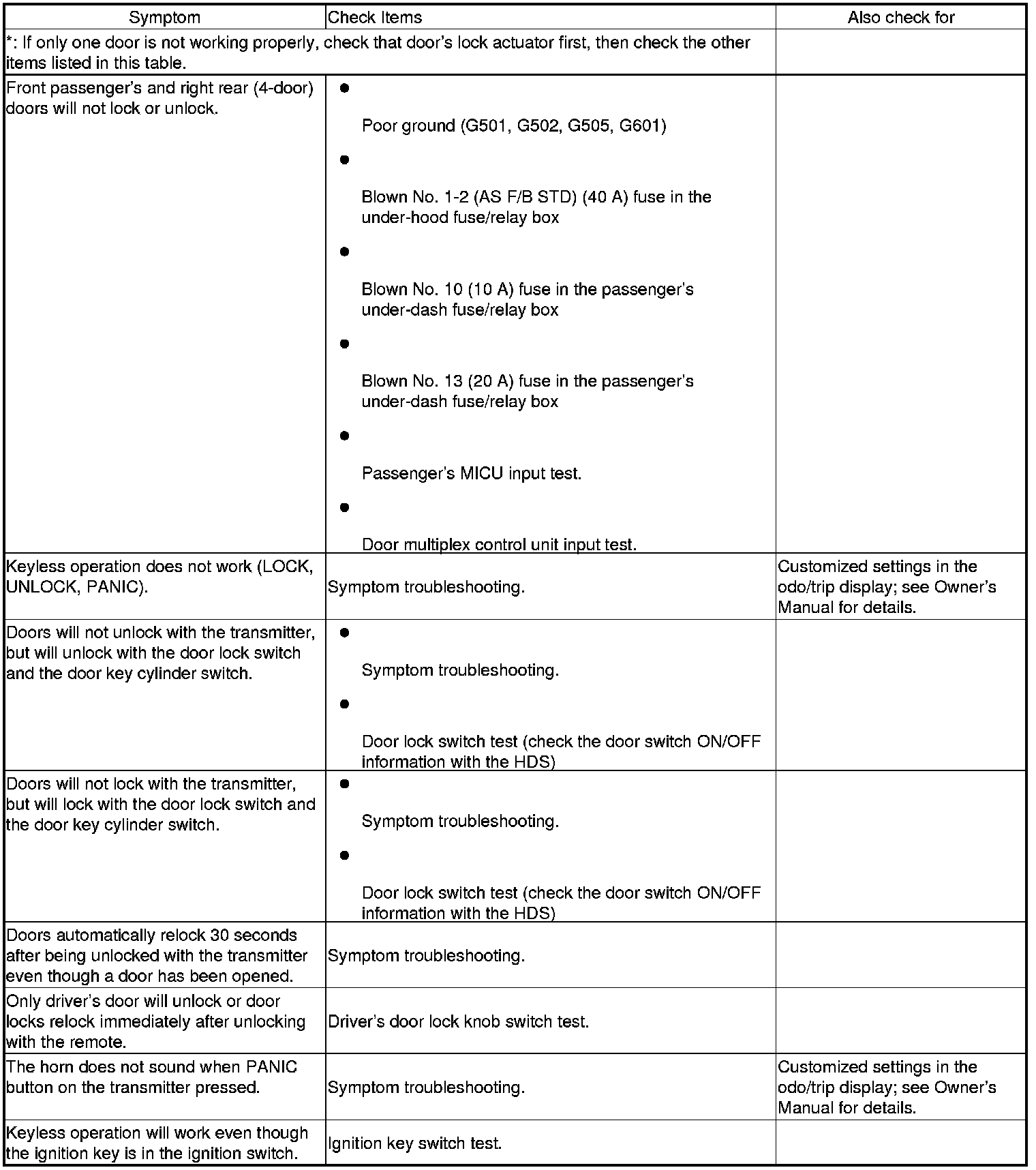 Keyless/Power Door Locks/Security System Symptom Troubleshooting Index