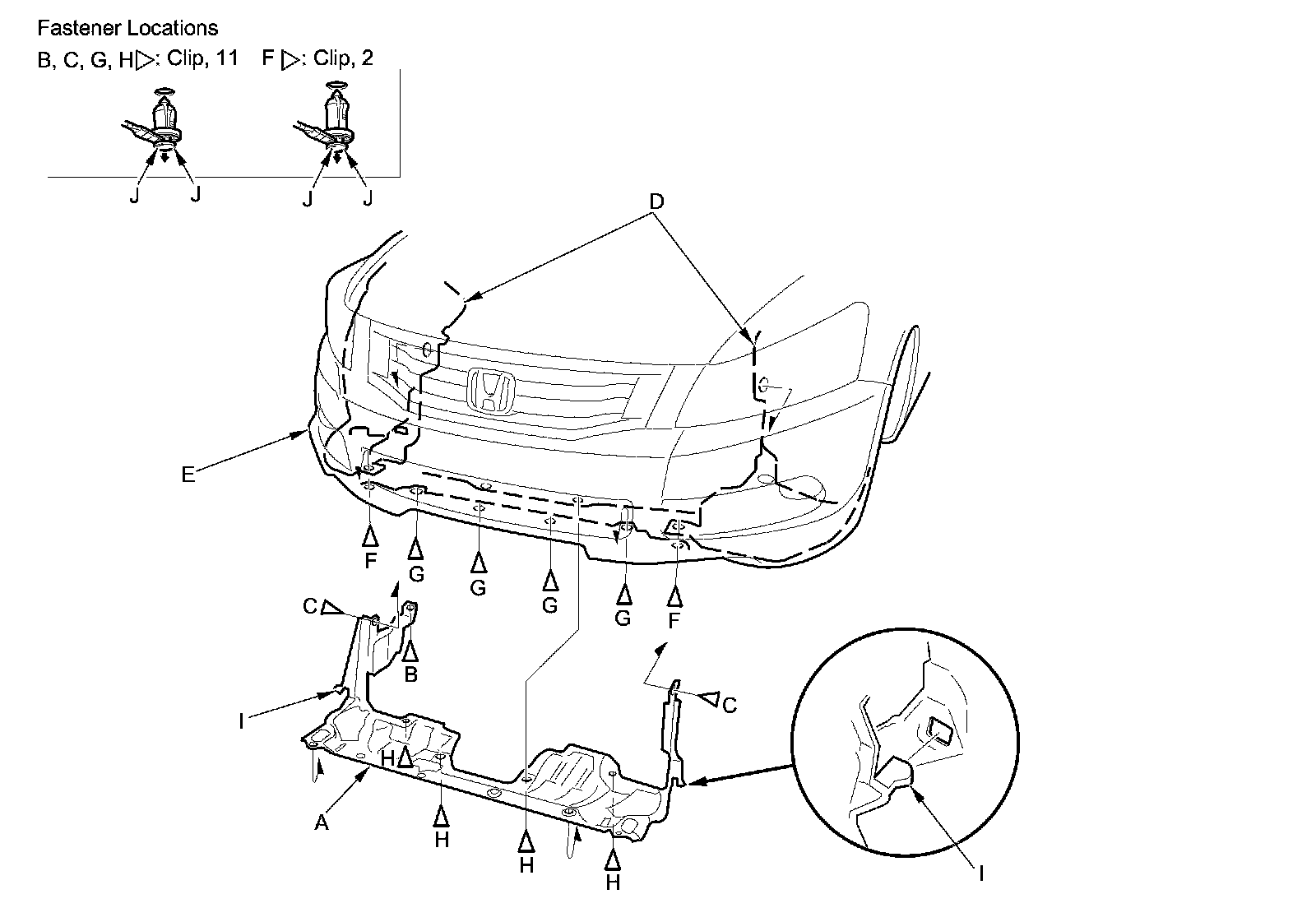 NOTE: To release the clips, pry up on the center pin at the notch (J).