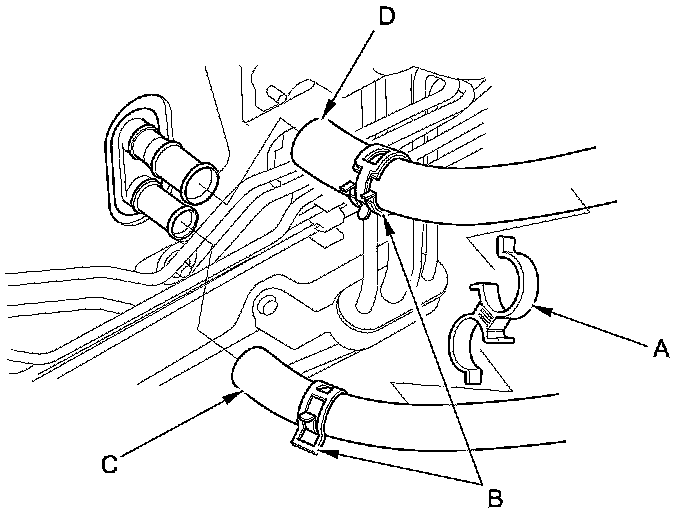 5. From under the hood, remove the clamp (A). Slide the hose clamps (B) back. Disconnect the inlet heater hose (C) and the outlet heater hose (D) from the heater unit. Note the layout of the hoses.