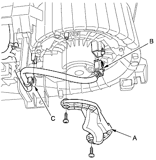 10. Disconnect the connector (B) from the blower motor. Detach the wire harness clip (C).