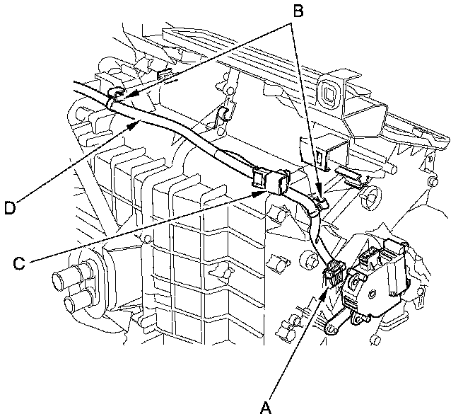 12. Disconnect the connector (A) from the air mix control motor. Detach the wire harness clips (B), and the connector clip (C), and remove the wire harness (D).
