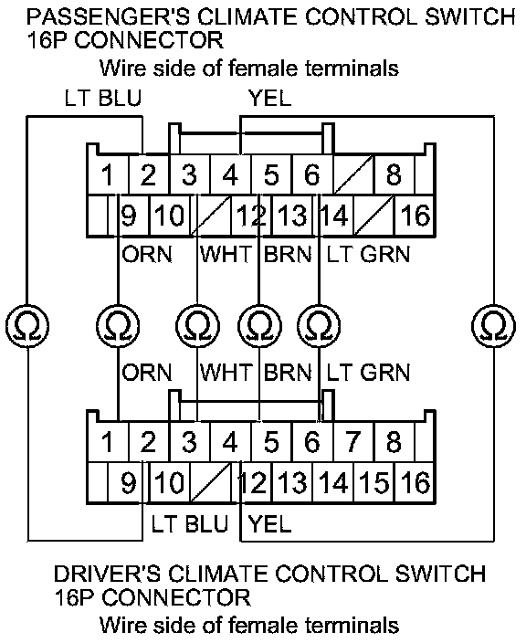 9. Check for continuity between the following terminals of the passenger's climate control switch 16P connector and the driver's climate control switch 16P connector.