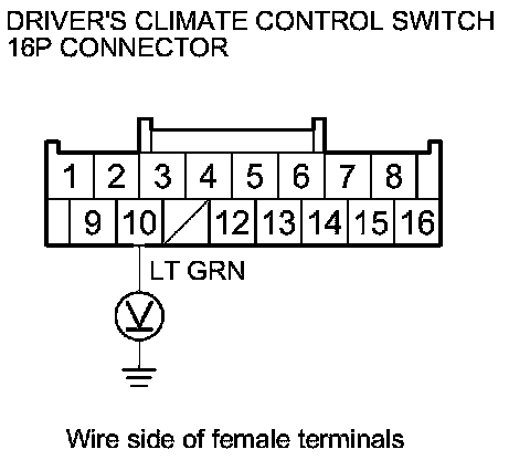 6. Measure the voltage between body ground and passenger's climate control switch 16P connector terminal No. 10.