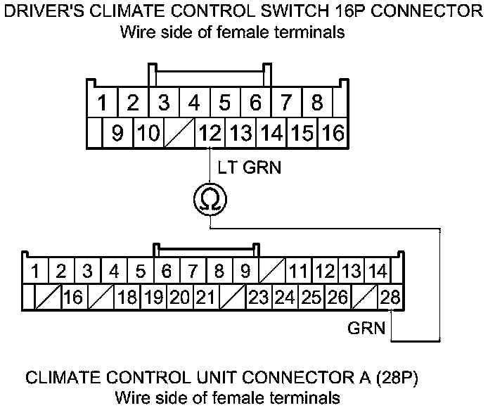 18. Check for continuity between driver's climate control switch 16P connector terminal No. 12 and climate control unit connector A (28P) terminal No. 28.