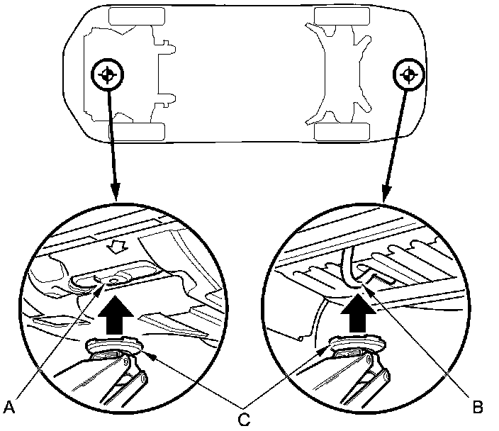 3. Position the floor jack under the front jacking bracket (A) or the rear jacking bracket (B). Center the jacking bracket on the jack lift platform (C), and jack up the vehicle high enough to fit the safety stands under it.