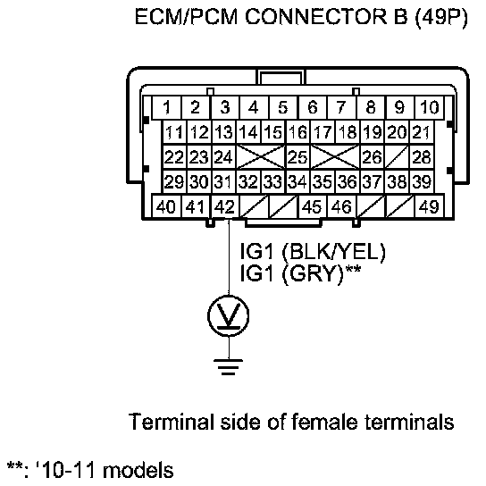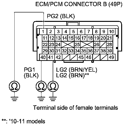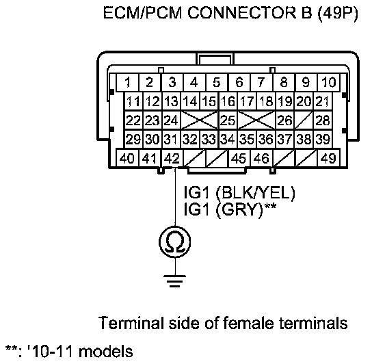 49. Check for continuity between ECM/PCM connector terminal B42 and body ground.