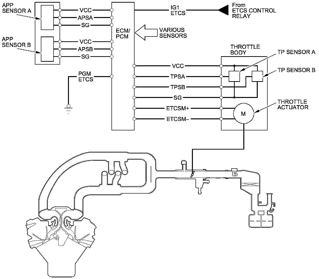 The electronic throttle control system consists of the throttle actuator, throttle position (TP) sensor A/B, accelerator pedal position (APP) sensor A/B, the electronic throttle control system (ETCS) control relay, and the ECM/PCM.