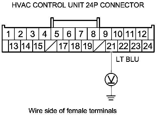 6. Measure the voltage between HVAC control unit 24P connector terminal No. 21 and body ground.