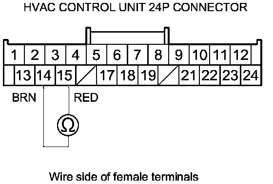 9. Measure the evaporator temperature sensor resistance between HVAC control unit 24P connector terminals No. 14 and No. 15.