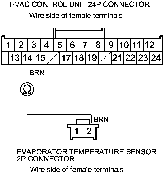 11. Check for continuity between HVAC control unit connector terminal No. 14 and evaporator temperature sensor 2P connector terminal No. 2.