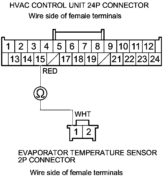 12. Check for continuity between HVAC control unit connector terminal No. 15 and evaporator temperature sensor 2P connector terminal No. 1.