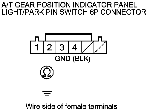 19. Check for continuity between A/T gear position indicator panel light/park pin switch 6P connector terminal No. 2 and body ground.
